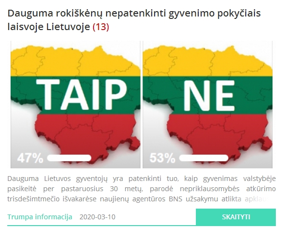 „Rokiškio Sirenos“ Facebook paskyroje kovo 9 d. paskelbtoje apklausoje iš viso balsavo 706 skaitytojai. 355 atsakė, jog yra patenkinti, 371 atsakė, jog yra nepatenkinti tuo, kaip gyvenimas Lietuvoje pasikeitė per pastaruosius 30 metų.“